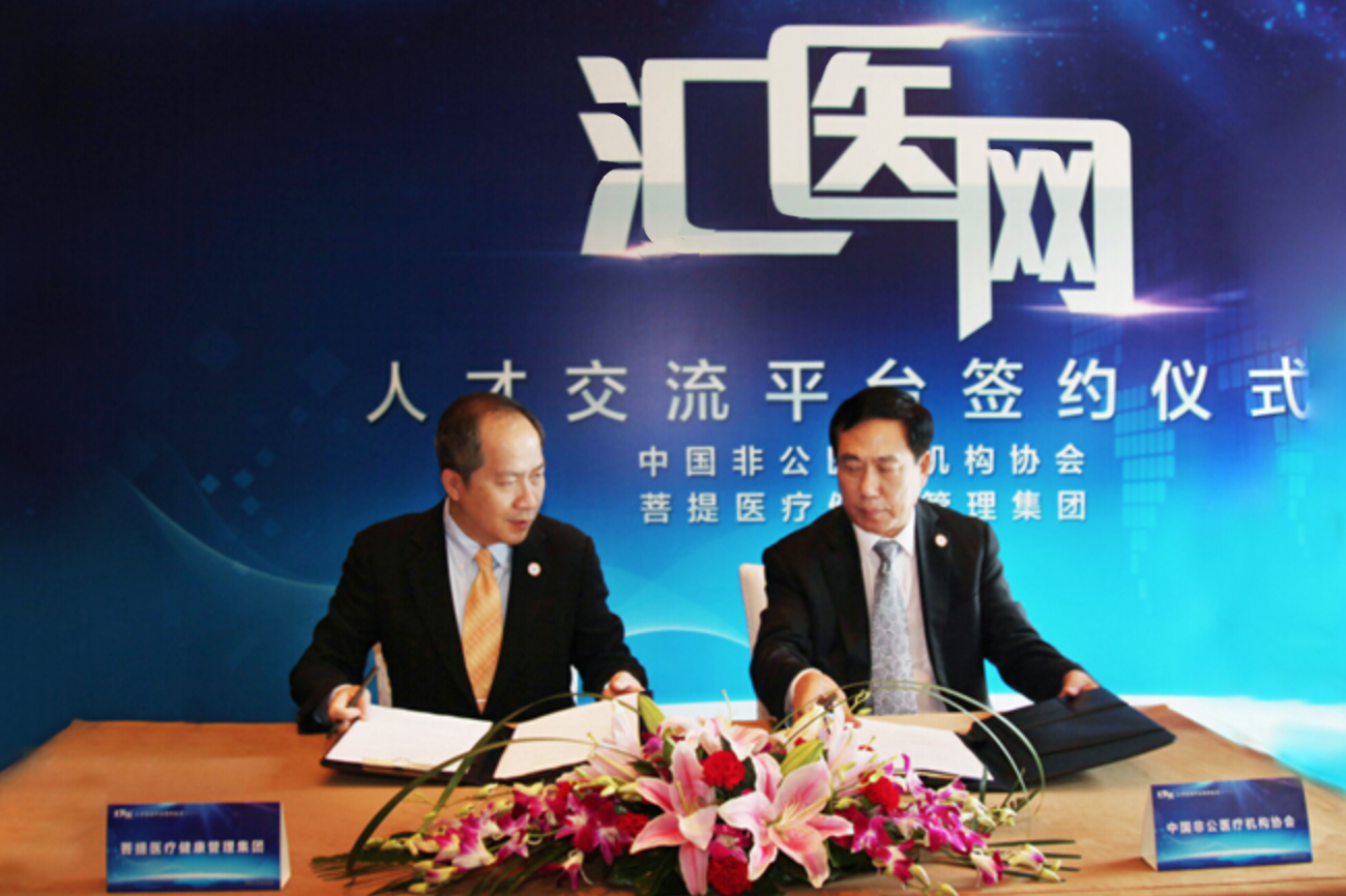 为解决民营、、、县级地市级公立医院医生资源匮乏的问题,,,加快医生多点执业政策落地,,,9月18日上午,,,菩提医疗集团与中国非公立医疗机构协会在北京举办“汇医网”人才交流平台签约仪式,,,,推行医疗人力资源服务计划。。。。协会副会长赵书贵先生、、、、郝德明先生,,菩提医疗集团董事会主席付钢先生、、、、CEO宋青女士、、、COO林振坤先生及集团公关部总监张圆女士共同出席了签约仪式,,同时参会的还有20家行业媒体。。。。
